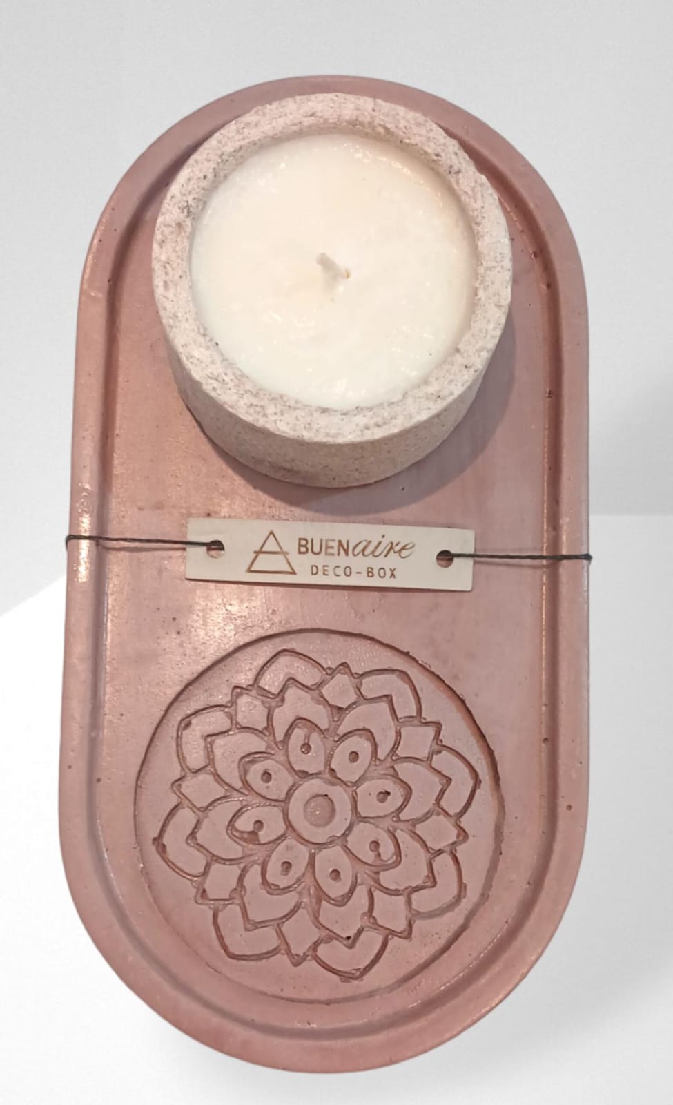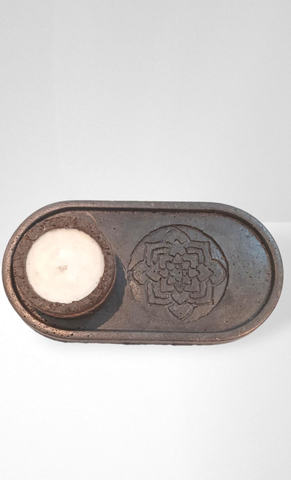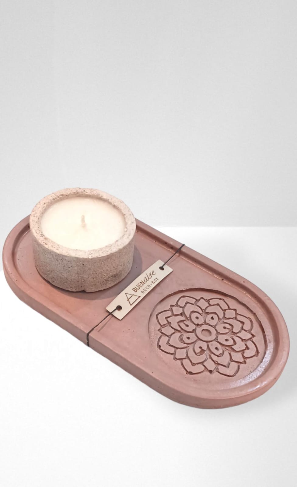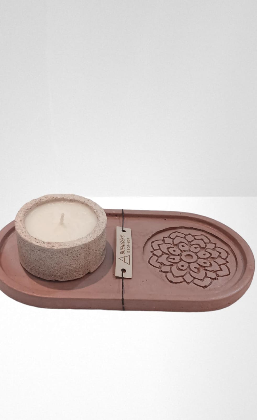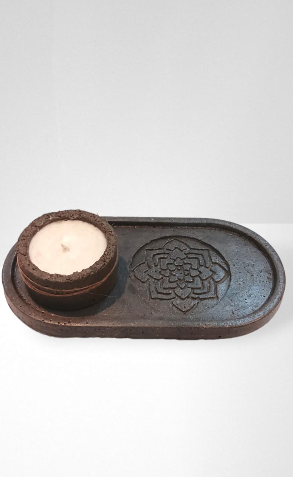 BANDEJA OVALADA DE CEMENTO MAS VELA EN CUENCO DE CEMENTO.
